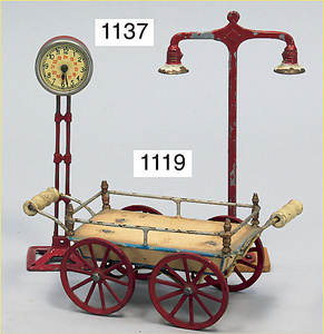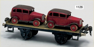 einfacher Plattformwagen, Spur 0, 11 cm, beladen mit 2 Penny Toys, Lazarettwagen, Blech lithogr., bespielt