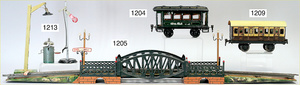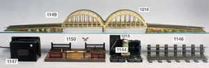 MÄRKLIN Uralt, Spur 0, Brücke, elektr. Ausführungen, Auffahrten mit gemauerter Unterführung u. Zäunen, Mittelteil in Eisenmanier, Telegraphenmast u. Steigungs-/Neigungstafel Nachbau, kl. Lackfehler, sowie Ausbesserungen, dekorativ, 108 cm