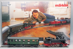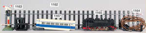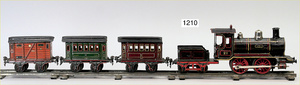 MÄRKLIN Spur 0, Zug bestehend aus Schlepptender-Lok B, 1040, Uhrwerkantrieb intakt, einige Stellen farbl. ausgebessert, 2-achsiger Tender in gutem Zust., Gepäckwagen 1891, Dach farbl. überarbeitet, 2 Personenwagen, 1872, 1 Gepäckwagen, 1873, bespielt