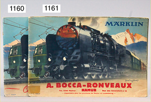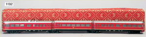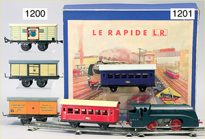 Zugpackung, Spur 0, Le rapide (L.R.), Tender-Lok, Sncr, Stromlinienform, Uhrwerkantrieb intakt, Gussgehäuse, 20 cm, dazu zwei 2-achsige Personenwagen, Schienenkreis, 1 Weiche, im Orig.-Kart.