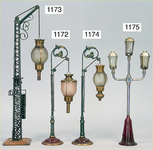 MÄRKLIN 2436, Laterne, 2-teiliger zusammengesteckter Gittermast, mit Treppenaufgang u. Plattform, mit Geländer, Ausleger mit Verzierungen, gr. Mattglaskugel in Messingfassung, Kettenaufzug, Kerzenbeleuchtung, 43 cm, 1900 - 1914, sehr schöner Orig.-Zust., Orig.-Kart., Kart. ohne Aufdruck