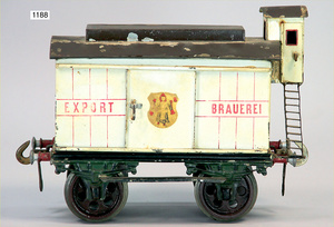 BING Spur 4, seltener Export Brauereiwagen, Münchner Kindl, 22 cm, Blech handlackiert, 2 Schiebetüren, Bremserhaus, Gussspeichenräder, unberührter Orig.-Zust., mit einigen altersbed. Lackfehlern am Dach, 1 Lötstelle am Bremserhaus nachgelötet