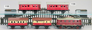 FLEISCHMANN Spur 0, Zug, bestehend aus Elektro-Lok, 1 B 1 335, 14 Volt, Guss, rot, zwei 2-achsige Personenwagen, 402, 3. Klasse, 1 Personenwagen 400, 2., 3. Klasse, sowie 1 Gepäckwagen 401, Lok in sehr gutem nahezu unbespielten Orig.-Zust., Wagen mit kleineren Spielspuren, Kratzer am Dach