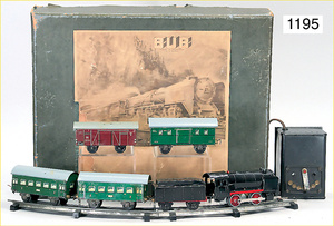 CARL BUB Schmalspur, 2,5 cm, Schlepptender-Lok B, elektr. Ausführung, 2 Personenwagen, Gepäckwagen, Güterwagen, Transformator, Gleismaterial mit Weichen, im Orig.-Kart.