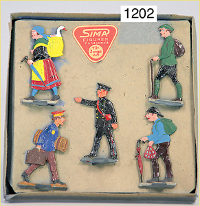 SIMA flache Bleifiguren, handbemalt, 6 cm, Schaffner u. Reisende, im Orig.-Kart., neuwertig