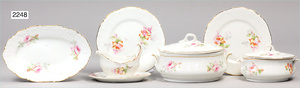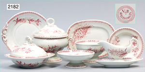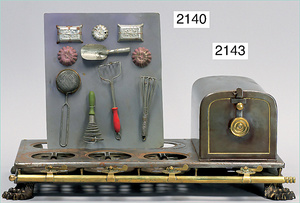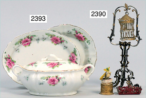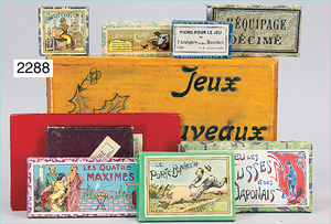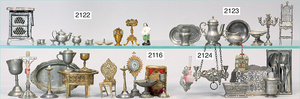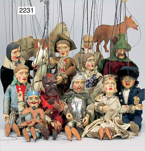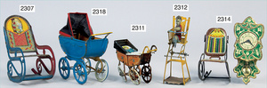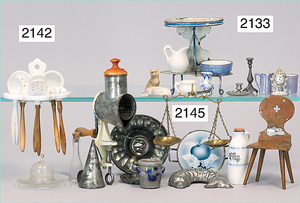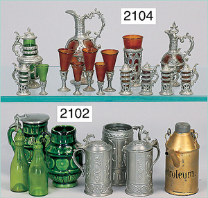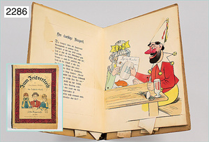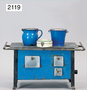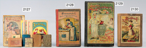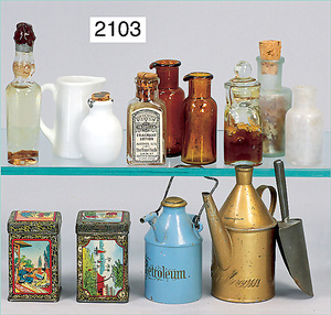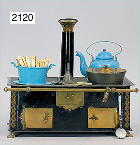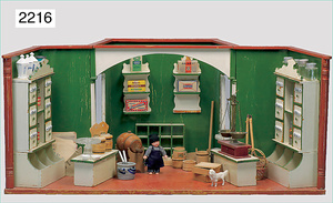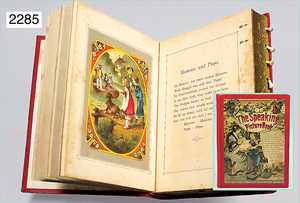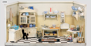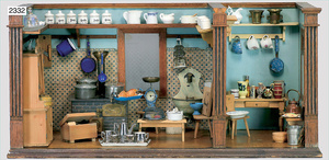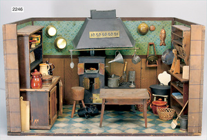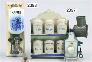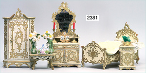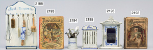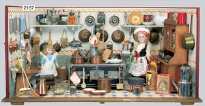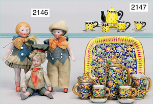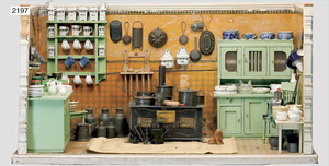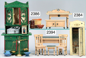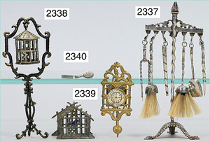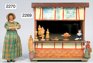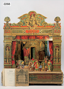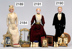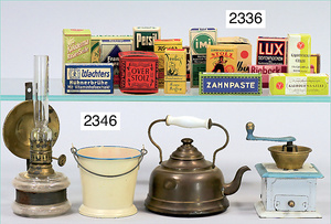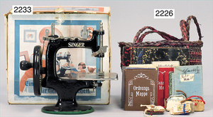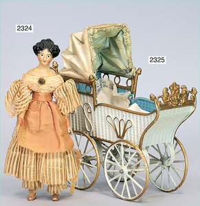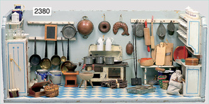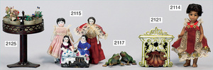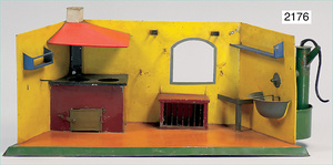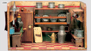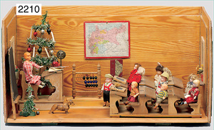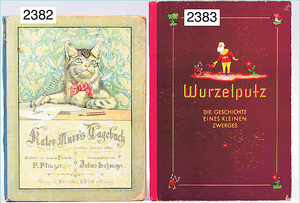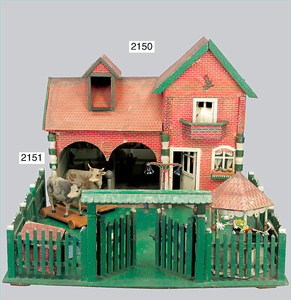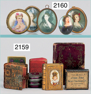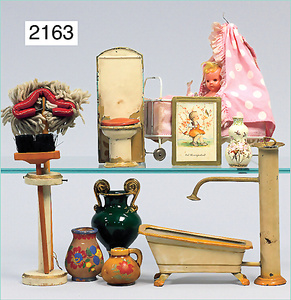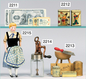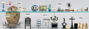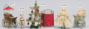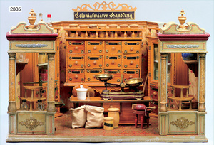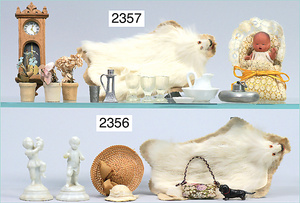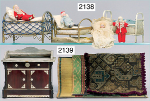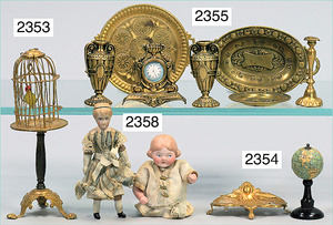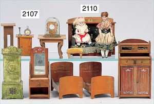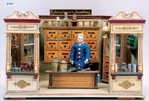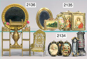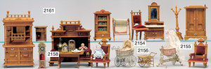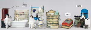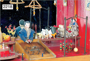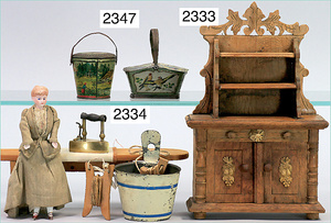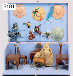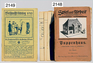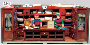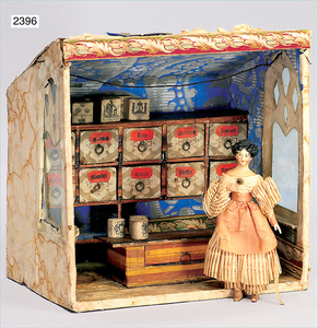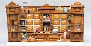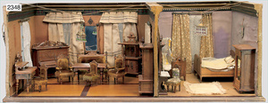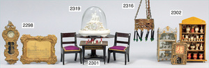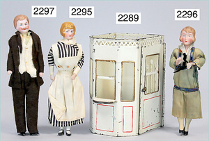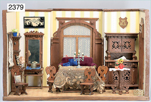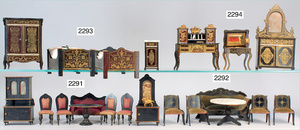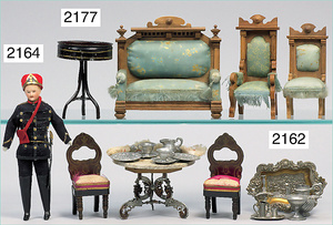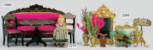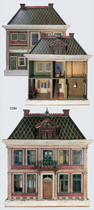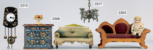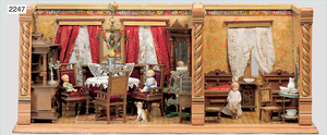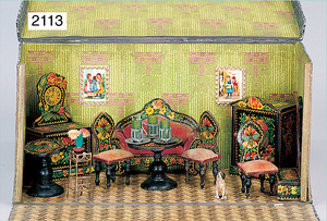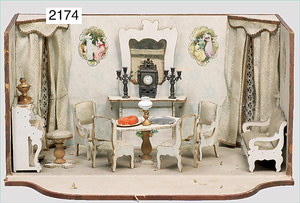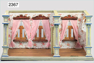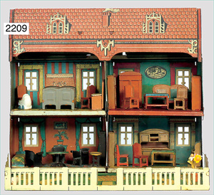 2-tlg. Puppenstube, ca. 1890, 1 m breit, 39 cm hoch, 57 cm tief, alte Tapete, Orig.-Bodenbemalung, Orig.-Außenbemalung, 4 Fenster, Durchgang, möbliert, mit hochwertigem Möbelprogramm, Klavier mit Musikspielwerk, Spitze an der Verzierung oben fehlt, Sitzgruppe, Aufsatzkommode, Schreibtisch, Spiegel, Vitrinenschrank, einige Schlafzimmer-Möbel, 2 hochwertige Deckenlampen, Messingblech, Glasperlen montiert, sehr schöner unberührter Dachbodenfund, 1 Spiegelglas gebrochen