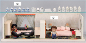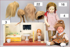 Puppenstube, 70er Jahre, 64 cm x 27 cm, mit Kunststoff-Mobiliar, Schlafzimmer u. Wohnzimmer, dazu 2 Puppenstuben-Püppchen