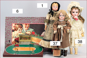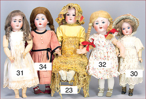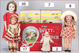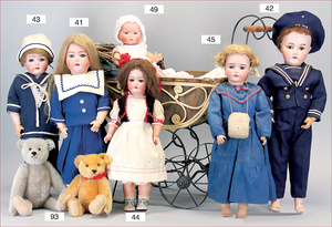 Porzellankopf-Puppe, gemarkt Dep. 6, braune Schlafaugen, off. Mund, Zähne, durchst. Ohren, Echthaarperücke fest aufgeklebt, von außen keine Risse erkennbar, bitte Transportrisiko für den Augenmechanismus beachten, kl. Farbabrieb auf der li. Wange, auf Masse-Gliederkörper, Hände und Beine überstrichen, 40 cm, Kleidung neu
