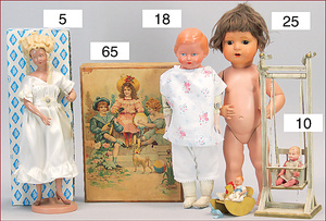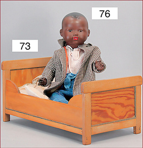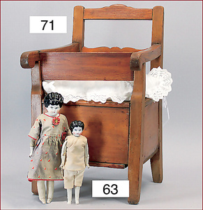 Puppenschaukel, Holz, beige/gold lackiert, Höhe 35 cm, kl. Holzpuppen-Wippe, dazu 2 Celluloid-Puppen, 1 x gemarkt SoR, 7 1/2, 1 x gemarkt CELLBA 11 1/2