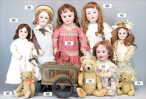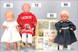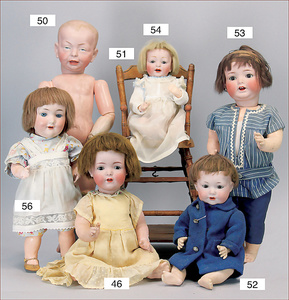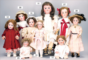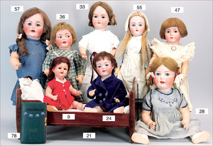 Porzellankopf-Puppe, gemarkt Germany 10, 1912, braune Schlafaugen, off. Mund, Zähne, Kinngrübchen, kl. Fehler im Porzellan auf der re. Stirnseite, Echthaarperücke, auf Masse-Gliederkörper, mit Kugelgelenken, 3 Finger ausgebessert, 73 cm, Kleidung neu