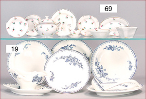Porzellan-Puppengeschirr, gemarkt Meibloem, Porzellan mit blauem Blumenmotiv, 3 Speiseteller, Durchm. 15,5 cm, 4 Suppenteller, 4 Dessertteller, 2 Platten, 1 Sauciere, 1 Schöpflöffel