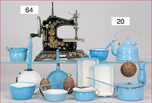 schönes Konv. Puppenküchengeschirr, weiß/blau emailliert, Töpfe, Pfannen, Wasserkessel, 2 Bräter, dazu 2 Kupferformen, neuer