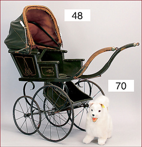 Vollkopf-Baby, gemarkt Germany, KB-5, blaue Schlafaugen, geschl. Mund, Masse-Sitzbabykörper, mit abstehendem Zeh, 36 cm, kl. Abplatzer an der Halskurbel, dazu 1 Puppenwagen, um 1910, Korb, mit Wachstuchverdeck, gedrehte Griffstange, Speichenräder, Stoff an einigen Stellen eingerissen