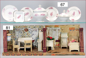 Puppen-Speiseservice, Porzellan, ungemarkt Rosenmotiv mit Goldrand, Terrine, Höhe 12 cm, Schale mit Deckel, 5 tiefe und 6 flache Teller, Durchm. 10 cm, 1 Platte, 1 rechteckige Schüssel