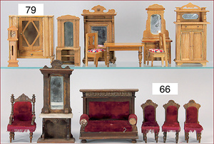 Konv. Puppenstubenmobiliar, Holz, wohl Gründerzeit, versch. Modelle, 2 Tische, 2 Schränke, 1 x verspiegelt, 1 Vertiko, 2 Stühle, 2 Spiegeltische mit Schubladen, u. anderes