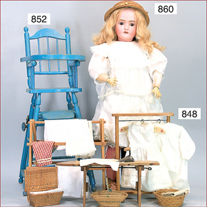 3 Porzellanpuppen, 1 x Puppenstuben-Puppe, bewegl. Arme und Beine, Kurbelkopf, blond modellierte Frisur, anmodellierte Schuhe und Strümpfe, 10 cm, 1 x Porzellan-Vollkopfjunge, Hersteller?, auf Masse-Sitzbabykörper, gemalte Augen, geschl. Mund, 15,5 cm, Halsausschnitt restauriert, 1 x Porzellan-Brustblattkopf-Puppe, Alter?, blond modellierte Frisur mit Haarband und modellierten Rosen, gemalte Augen, geschl. Mund, auf neuem Holz-Gliederkörper, 22 cm