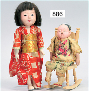 SCHILDKRÖT Celluloid-Brustblattkopf-Puppe, blaue nachträglich fest eingesetzte Glasaugen, off. Mund, Echthaarperücke aufgeklebt, Wachstuchkörper, Celluloid-Arme, 40 cm, mit 1 Puppen-Stuhl