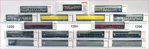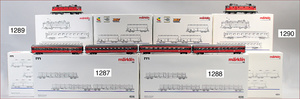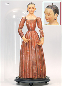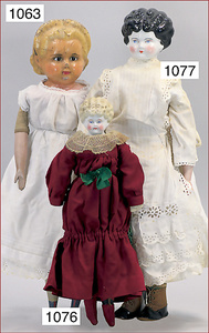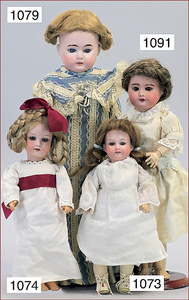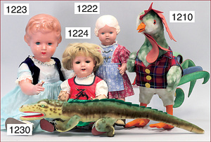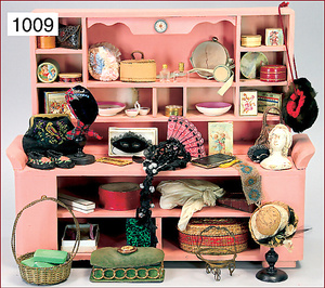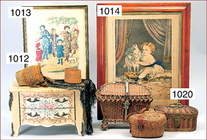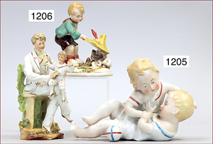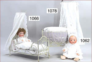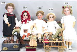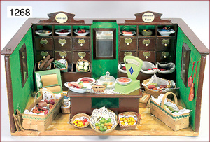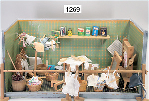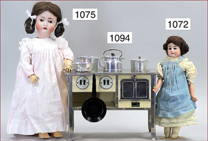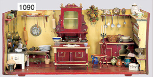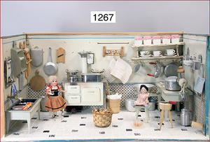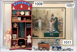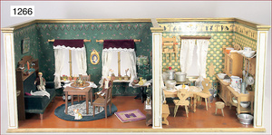 2-tlg. Puppenstube, um 1920, mit Durchgangstür, Fenster unverglast, Länge 1 m, Tiefe 42 cm, Höhe 42 cm, mit reichh. Mobiliar, Wohnzimmer mit Spiegel, Couch mit Hochlehner, Ablage, 1 Tisch, 3 Stühle, kl. runder Tisch, 2 Porzellan-Puppenstuben-Puppen, blond modellierte Frisuren, Stoffkörper, Küche, mit kl. Blechherd, Küchenschrank, Anrichte, Tisch, 2 Stühle, Board, einige Teile Weißblech u. Porzellan