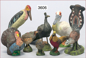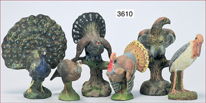 10 Teile Vögel, Masse, ungemarkt, Perlhuhn, Truthahn, Pfau, Zust. 1-2