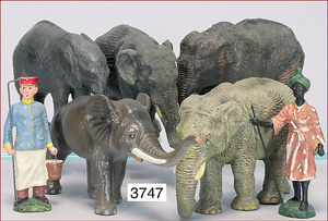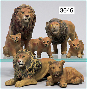 meist ELASTOLIN Löwenszene, 7-teilig, Masse, 5 cm - 12 cm, Zust. 1-2