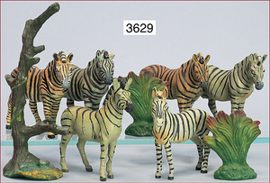 6 Teile, Masse, Zebragruppe, 11 cm, dazu 1 Baumstumpf, sowie 2 Sträucher, DUSO, Zust. 2, minimale Stellen ausgebessert