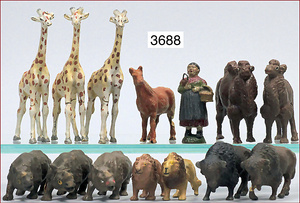 Konv. Bauernhoffiguren, kl. Serie, 3 Massefiguren, 5 cm - 5,5 cm, 1 x ohne Arm, dazu 16 Tiere, Esel, Pferde, Zugpferde, Federvieh, 1 Brunnen, meist Zust. 2, dazu 1 Bauernhaus Holz/Masse