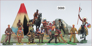 meist ELASTOLIN Kunststoff, Trapper u. Indianer, ca. 20 Teile, teils guter Zust., teils kl. Beschädigungen, dazu 4 Zelte
