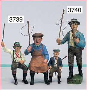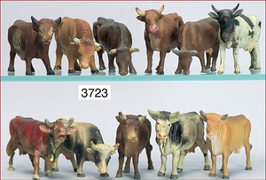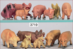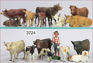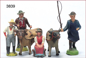 Konv. 4 Masse-Figuren, 5 cm - 6 cm, Bauernhof, dazu 2 Zugochsen, ELASTOLIN, u. a., Zust. 2