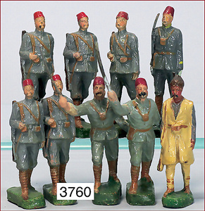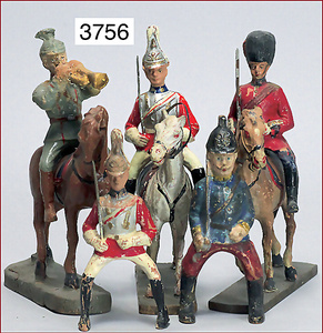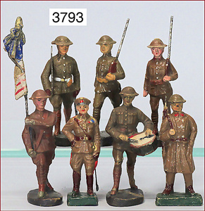 2 Teile LINEOL, engl. Gardesoldaten, 7,5 u. 9 cm, dazu 3 Franzosen, DUOLIN, 2 Figuren ELASTOLIN, Masse, Zust. 2-3