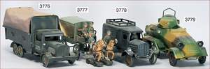 Panzerspähwagen, Blech lithogr., 17,5 cm, Uhrwerk intakt, sehr guter Zust., mit Figur, Figur stärker bespielt, im Orig.-Kart., mit Schlüssel