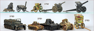 TIPP & CO Flaggeschütz, Blech o. Deichsel, 1 Geschütz o. Räder, 1 Mörser, Scheinwerfer, kl. Tank, 2 Zugpferde, teils restaurierungsbedürftig