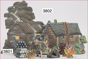 Konv. Geländeteile, Blockhütte, Brunnen, ELASTOLIN, Holz/Masse, Stall, Vogelhaus