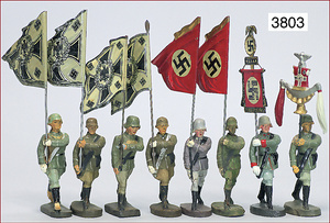 8 Teile ELASTOLIN, Fahnenträger, Fahnen Zust. 1-2, Figuren Zust. 2-3, 7 cm, minimale Stellen ausgebessert