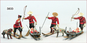 Konv. Kanadier, 2 Skifahrer, Masse, 6 cm, 2 Verwundete auf Schlitten, Blech/Masse, 2 Sanitätshunde, altersbed. Lackabplatzer, sonst gut, selten