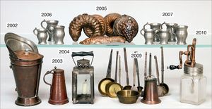 Konv. Kupfer-, Messing- und Blech-Teile, außergew. Kanne mit Henkel, Kupfer, innen verzinnt, 6 cm, Pfannen, Schöpfer, Backformen, insgesamt 12 Teile