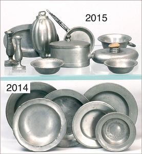 10 Teile, Zinn, Nürnberger Würstchendose mit Deckel, 5,5 cm, 2 Leuchter, Schalen, Teller, Bettflasche