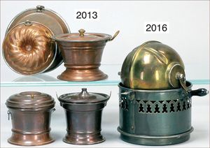 7 Teile Kupfer, Abfalleimer mit Deckel, innen verzinnt, 5 cm hoch, eine Schüssel mit Deckel, Bräter, Backform, Henkelschüssel