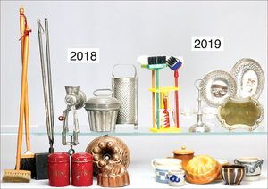 Konv. Küchenzubehör, Tontöpfe, 5 cm - 8 cm, Porzellankuchenform, silber emaillierte Schalen, Glaskuchenteller, filigran gearbeiteter Schalenständer, silber, Holzständer mit mehreren Besen