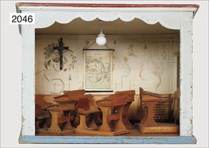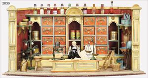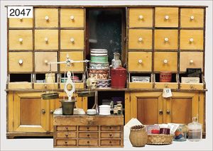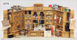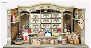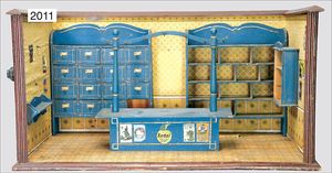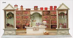 Kaufladen, Manufakturarbeit, ca. 1815, 68 cm, verzierte Frontleisten, Schubladen (3 Schubladen fehlen), alte Tapete an Wand und Boden, alte Bemalung, Orig.-Theke, reichhaltig Zubehör, lithogr. Dosen, darunter eine mit Knauf, Waage, Glas- und Holzteile