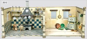 Rauchfangküche mit Vorratskammer, 89 cm breit, 32 cm hoch, 41 cm tief, Durchgangstür, Regale, Rauchfang und Feuerstelle später, einige Zinnteile, Hackklotz, einige Keramikteile, Metalltisch