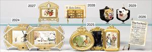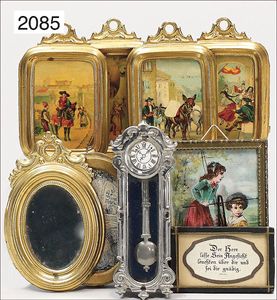 Puppenstuben-Ausschmückungsteile, 4 Bilder, mit Rahmen, Messingblech vergoldet, 7 cm, 3 kl. Bilder, 1 Wachsengel, 1 Puppenstubenuhr, 9 cm, 1 Spiegel, Messingblech vergoldet