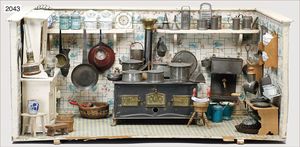 Puppenküche, ca. 1910, 102 cm breit, 44 cm hoch, 48 cm tief, alte Tapete an der Wand, Boden überstrichen, möbliert, mit Herd, Topfsatz am Herd nicht orig., reichh. Zubehör, blau/weiß emailliert, Porzellan-, Blech- Teile, 1 Biskuitporzellankopf-Puppe, ungemarkt, 29 cm, Kurbelkopf, braune festeingesetzte Glasaugen, off. Mund, oben Zähne, bespielter Gliederkörper, mit kl. älteren Ausbesserungen, alte Kleidung, alte Schuhe