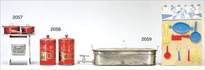 außergew. Puppenküchen-Herd, 31 cm breit, 36 cm hoch, 24 cm tief, Blech emailliert, vorne Blumendekor, seitl. auflithogr. Koch- und Spielszenen, Griffstange, Wasserschiff, Wasserkessel, Topfpfanne, Kakaokocher ohne Quirl, bis auf kl. altersbed. Emaille-Abplatzer sehr schöner Orig.-Zust., absolut selten
