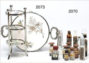 Konv. 2 Teile, 1 x Tortenständer, 3 Etagen, Blech vernickelt, glasiertes Keramik montiert, mit Blumendekor, gemarkt B5, 14 cm hoch, Durchm. einer Platte 5 cm, dazu 1 Tortenplatte, mit 3 versch. Blumendekoren, 11 cm Durchm., für Küche oder Konditorei, schönes Konv.