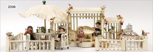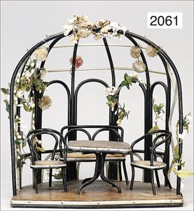 Wintergarten, Holz, 42 cm breit, 22 cm hoch, reichhaltig Zubehör, Sitzgruppe, Blech, Blumenbank, Blumenkästen, 3 Celluloid-Puppenstuben-Puppen, 1 Porzellanpuppenstuben- Puppe, Zaunteile, Sitzgruppe mit Schirm, dekorativ