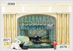 Kleines Papiertheater, ca. 1880, Druck handkoloriert, mit Kurbelantrieb, Antrieb hängt, 22 cm breit, 18,5 cm hoch