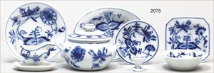 Konv. Puppenküchen-Porzellan, blau/weißes Zwiebelmuster, 12 Teller, Sauciere, Schale, Schüssel, gr. Servierteller, Servierschale, gr. Suppenterrine mit Deckel, Eierbecher, Durchm. 12 cm - 15 cm, für gr. Puppenstube