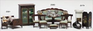 außergew. Sitzgruppe, Art Deco, umbautes Sofa, mit Spiegel, 16 cm breit, 23,5 cm hoch, Tisch 11,5 cm lang, 6 Stühle, 2 Sessel, im Orig.-Kart., teilw. hat sich der Kleber an den Polsterteilen gelöst, nahezu unbespielt