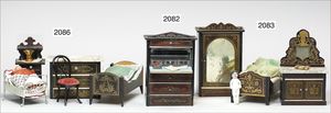 Möbelprogramm, Laubsägearbeit, Otto-Meier-Ravensburg, Schrank, 30 cm hoch, Frisier-Kommode mit Spiegel, Bett, Orig.-Bettzeug, mit Himmel, 1 Stuhl, schöne Arbeit