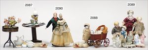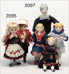 6 Teile, Puppenstuben - Puppen, teils Ganzbiskuit, teils Biskuit/Stoff, teils glasiertes Porzellan, untersch. Größen und Qualität